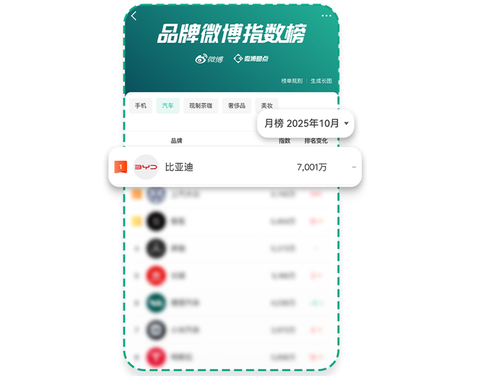 「品牌微博指数」的行业榜单功能,恰好为品牌提供了这一视角。当前榜单覆盖汽车、手机、茶咖、奢侈品、美妆五大垂直行业(未来将陆续覆盖更多热门行业),支持周榜与月榜的切换,帮助品牌建立纵向与横向的参照坐标。