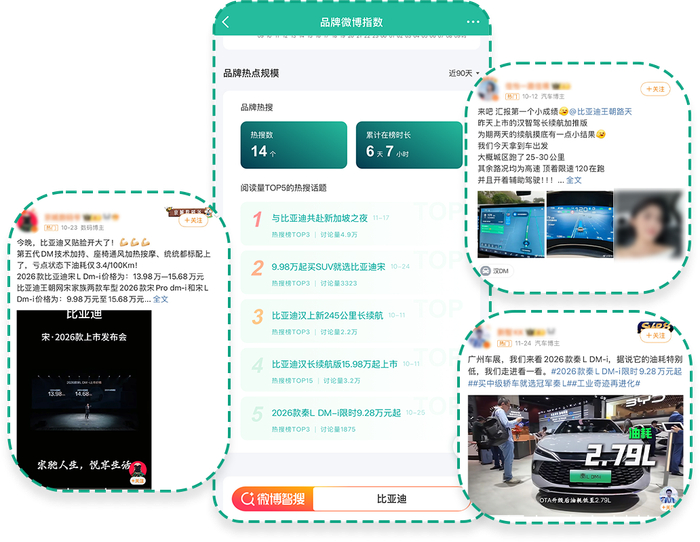近90天内,比亚迪凭借多款产品与主题活动,在微博持续收获高热讨论。其中,#与比亚迪共赴新加坡之夜##9.98万起买SUV就选比亚迪宋##比亚迪汉上新245公里长续航##2026款秦L DM-i限时9.28万起#4大话题均冲上热搜榜TOP3。据「品牌微博指数」数据显示,近90天比亚迪累计登上热搜14个,累计在榜时长长达6天7小时,并在9月、10月汽车行业品牌微博指数榜蝉联榜首。