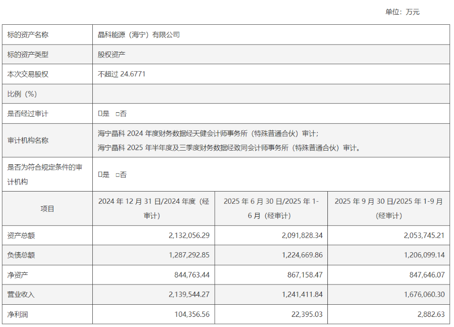 2024年及2025年前三季度,海宁晶科实现的营业收入分别为213.95亿元、167.61亿元,对应的净利润为10.44亿元、2882.63万元。