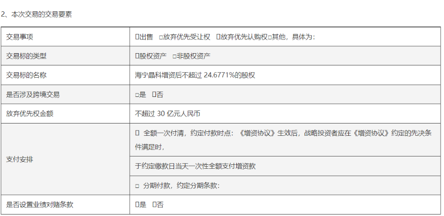 1月17日,晶科能源发布公告披露,公司控股子公司晶科能源(海宁)有限公司(以下简称海宁晶科)拟实施增资扩股,引入兴银金融资产投资有限公司(以下简称兴银资产)等战略投资者,合计以现金增资不超过30亿元。