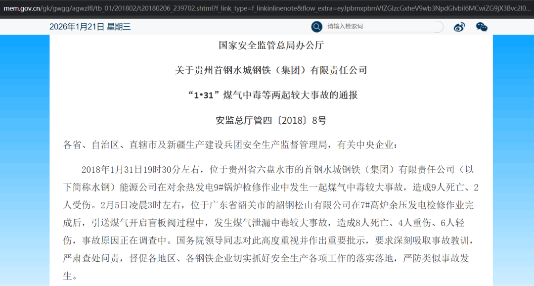 国家安全监管总局关于河北省遵化市港陆钢铁有限公司“12.24”重大煤气泄漏事故的通报(https://www.mem.gov.cn/gk/gwgg/agwzlfl/tb_01/200812/t20081229_239173.shtml)