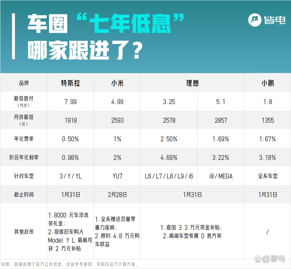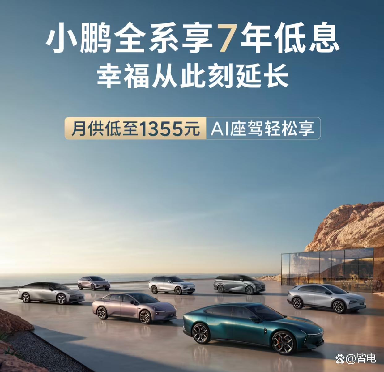 小鹏汽车紧随其后,1月22日官宣限时7年低息政策,覆盖全系车型,以入门款MONA M03为例,15%首付后月供低至1355元,精准狙击预算敏感型用户,活动截止1月31日。