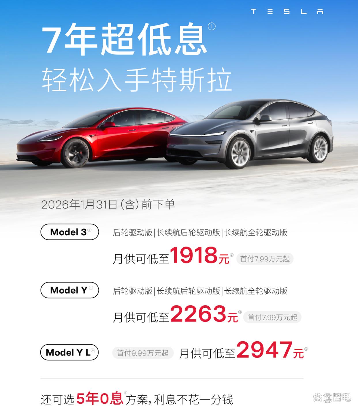 1月6日,特斯拉中国率先抛出重磅炸弹,推出限时7年(84期)超低息购车方案,年化利率低至0.98%,Model 3月供低至1918元、日供仅63元,直接击穿行业常规车贷周期上限。这一举措迅速引发连锁反应,多家车企密集跟进,一场围绕“超长分期”的较量正式拉开帷幕。