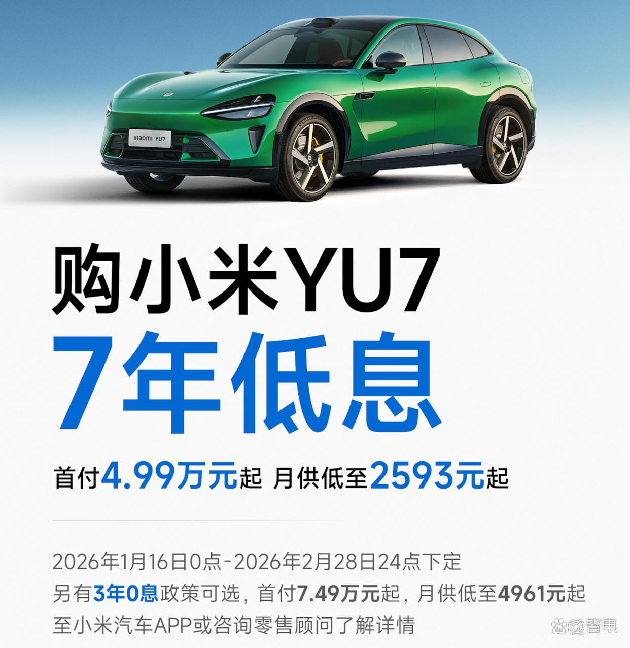 小米汽车于1月15日快速响应,为YU7全系车型推出7年低息方案,年化利率约1%,首付4.99万起,月供低至2593元,同时叠加赠送价值超万元的双零重力座椅,以“金融+配置”组合拳吸引用户,活动持续至2月28日。