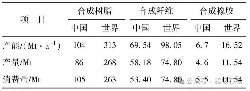表1 2021年我国通用合成树脂、合成纤维、合成橡胶的产能、产量和消费量