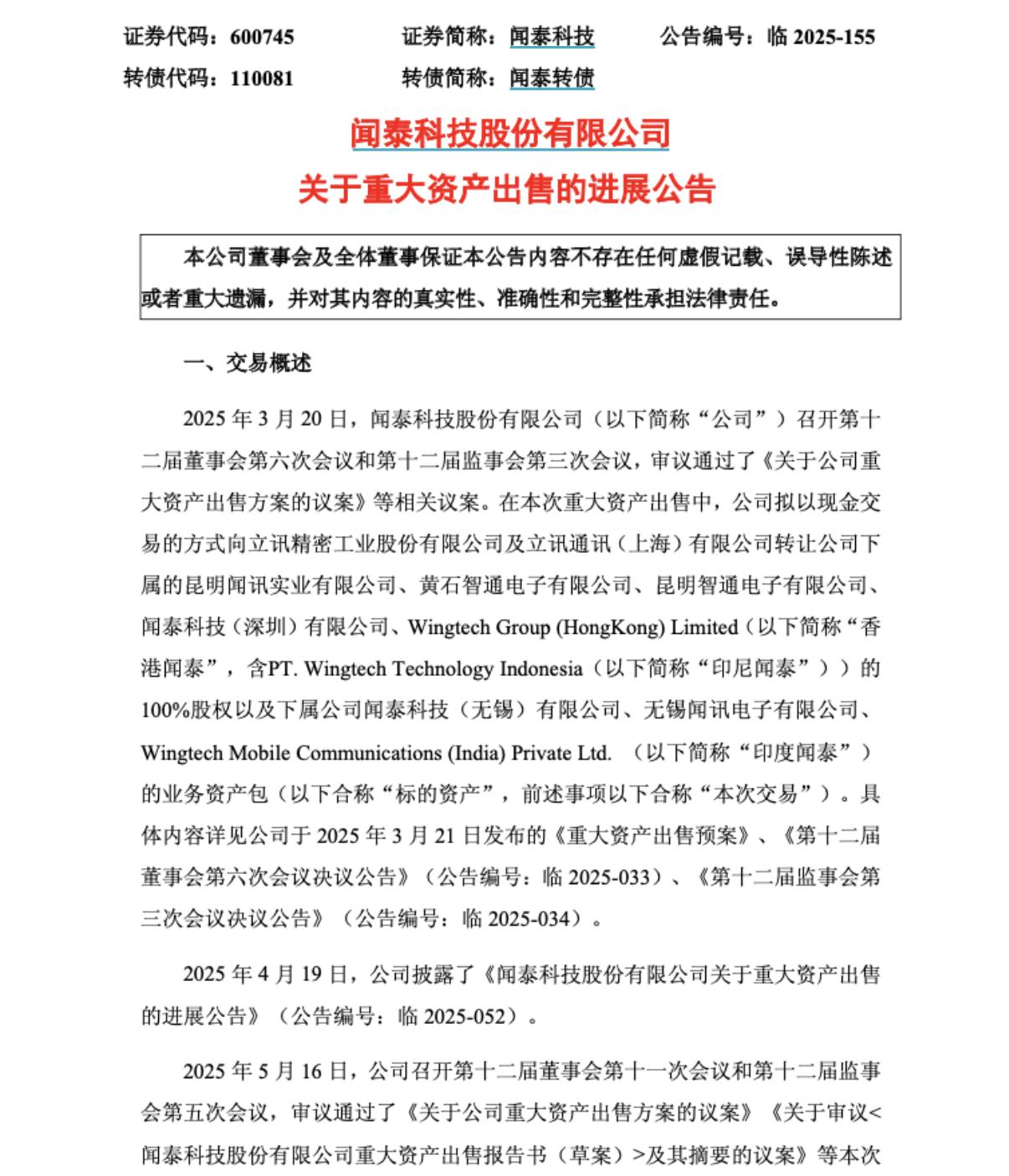 此外,在上述和立讯精密的交易中,包括印度闻泰出售的业务资产的账面金额合计为3.11亿元,占拟出售资产合计净资产账面金额的比例为7.09%。但这笔交易由于印度闻泰相关资产存在包括资产查封、冻结等在内的交割受限情形,导致无法办理权属变更手续,相关资产交易未完成权属交割。