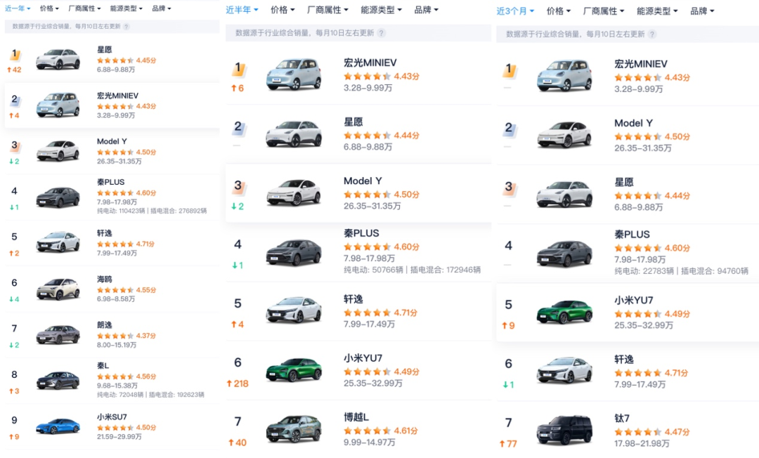 Model Y均在列,另一款均为小米。最近一年小米SU7排在第9、最近半年小米YU7排在第6、最近三个月小米YU7排在第5。