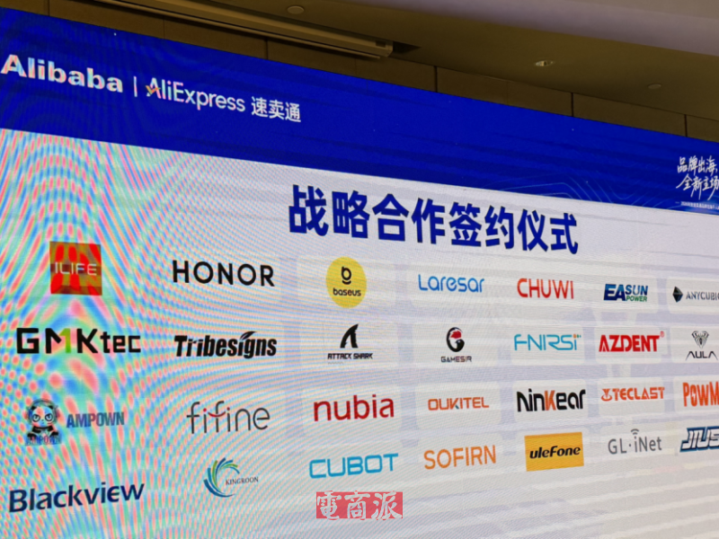 网上流传的现场图显示,当天参与签约的品牌主要是消费电子、智能硬件、智能家电等高科技、高附加值类目,包括:游戏手柄Top品牌GameSir、笔电Top品牌驰为、三防手机Top品牌CUBOT、亚马逊家居大卖致远科技、以及已经在速卖通上成长为波兰国民级品牌的ILIFE等……一系列跨境圈耳熟能详的品牌赫然在列。