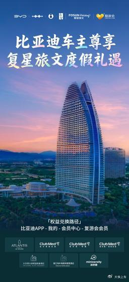 仅签约一个月,双方首个合作项目迅速落地:比亚迪全品牌车主可通过App一键兑换复游会(Foryou Club)高等级会员会籍,解锁三亚·亚特兰蒂斯、Club Med地中海俱乐部等高端度假场景的专属礼遇。复星旅文全球超2000万会员体系的接入,标志着比亚迪车主权益从“用车服务”正式迈向“品质生活”。