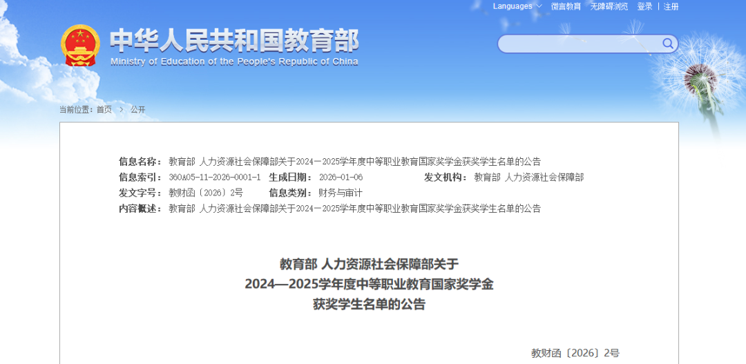 根据《财政部教育部关于调整职业院校奖助学金政策的通知》(财教〔2019〕25号)和《教育部人力资源社会保障部财政部关于印发〈中等职业教育国家奖学金评审办法〉的通知》(教财〔2023〕11号)规定,教育部、人力资源社会保障部、财政部联合成立了中等职业教育国家奖学金评审领导小组,设立了中等职业教育国家奖学金评审委员会,按照客观、公平、公正的原则,对2025年各省(区、市)、各计划单列市、新疆生产建设兵团、北大荒农垦集团有限公司、广东省农垦总局教育部门和人力资源社会保障部门所属中等职业学校(含技工学校,下同),教育部直属高等学校附属中等职业学校报送的评审材料进行了认真评审。经评审确定,共19992名学生获得2024—2025学年度中等职业教育国家奖学金,每人奖励6000元,现予公告。