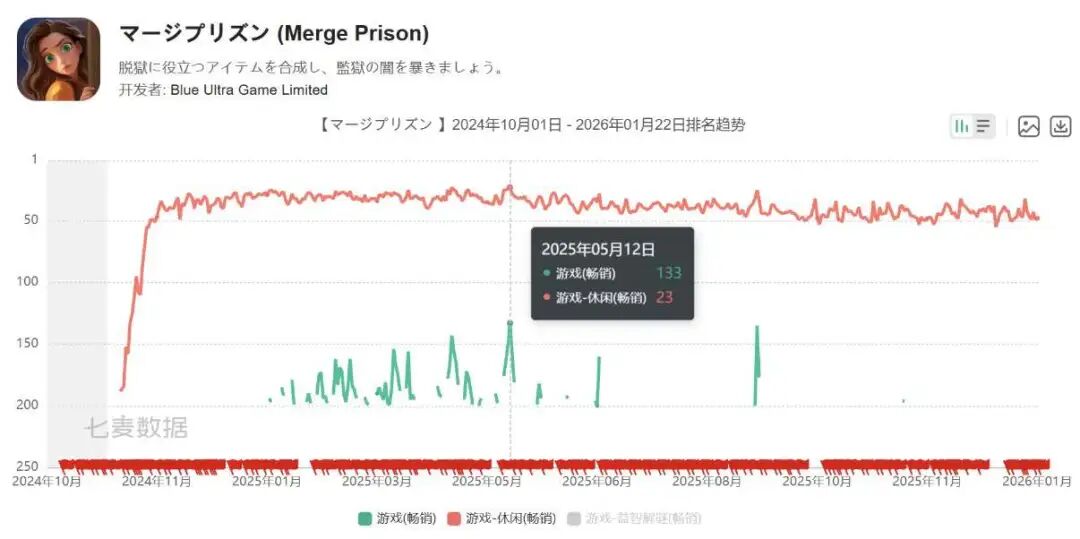 通过题材差异化跑出来的产品,还有位列榜单第9名的《Merge Prison:Hidden Puzzle》,来自北京蓝色奥义,是一家疑似从江娱互动体系独立出来的厂商。这款游戏以监狱密室逃脱为题材,还融合了解谜玩法,切入点相当新奇。