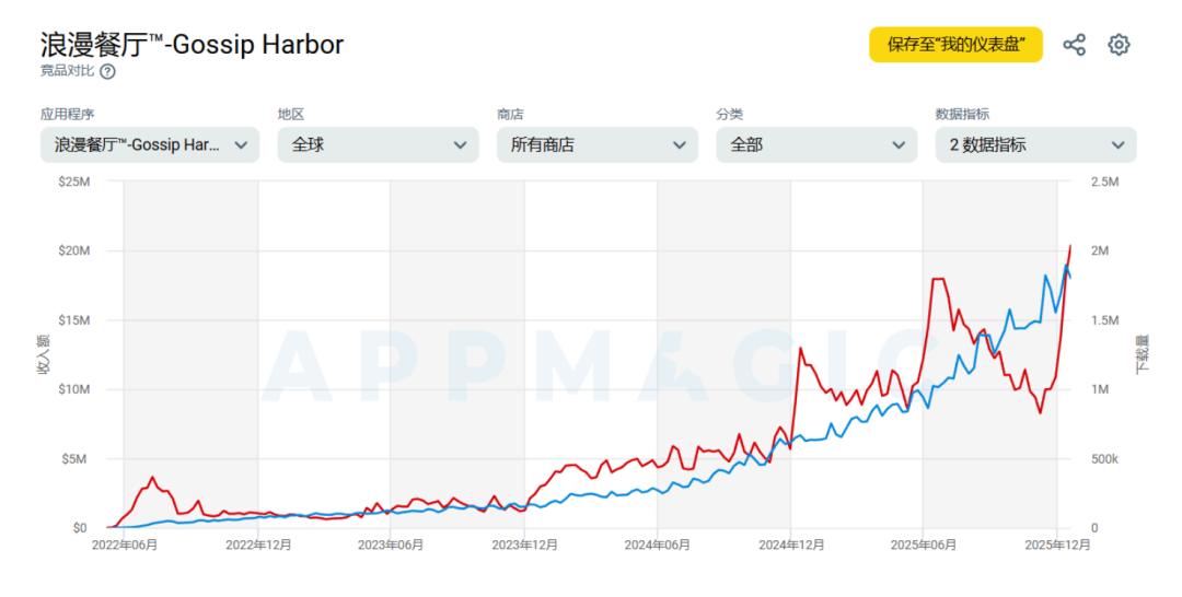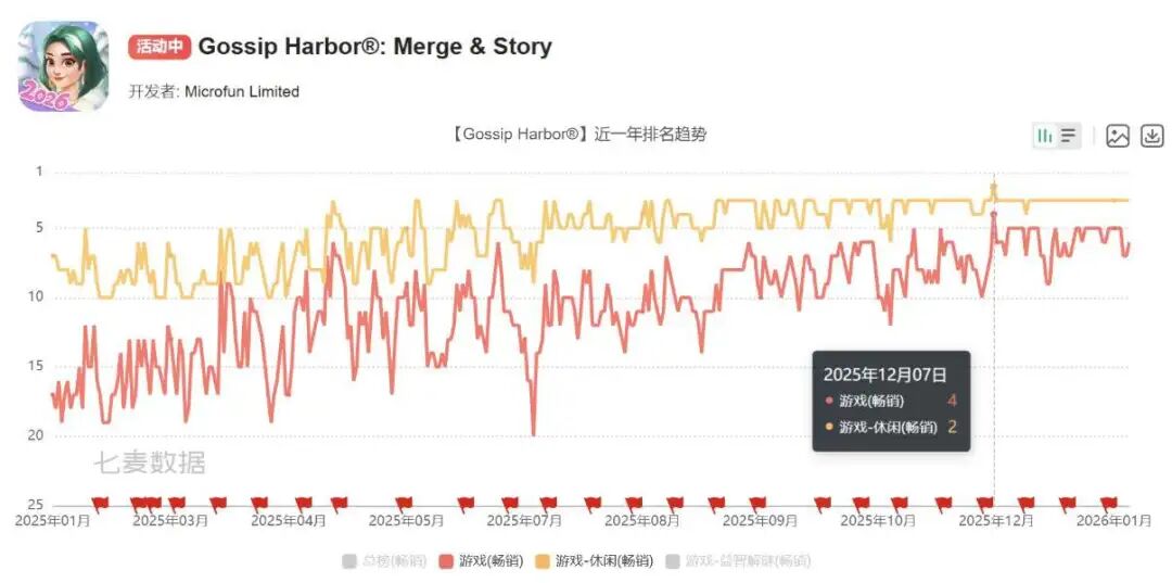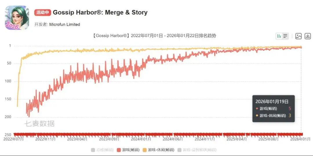 榜首《浪漫餐厅(Gossip Harbor:Merge & Story)》2025年在海外市场创造了约45亿流水,收入占比也达到了统计范围(TOP400)的44%,相当强悍。这款游戏自2022年上线以来收入一直在稳步增长,以美国市场的iOS畅销榜排名为例,游戏的收入排名峰值已达到第4名,且仍呈稳定的增长趋势。