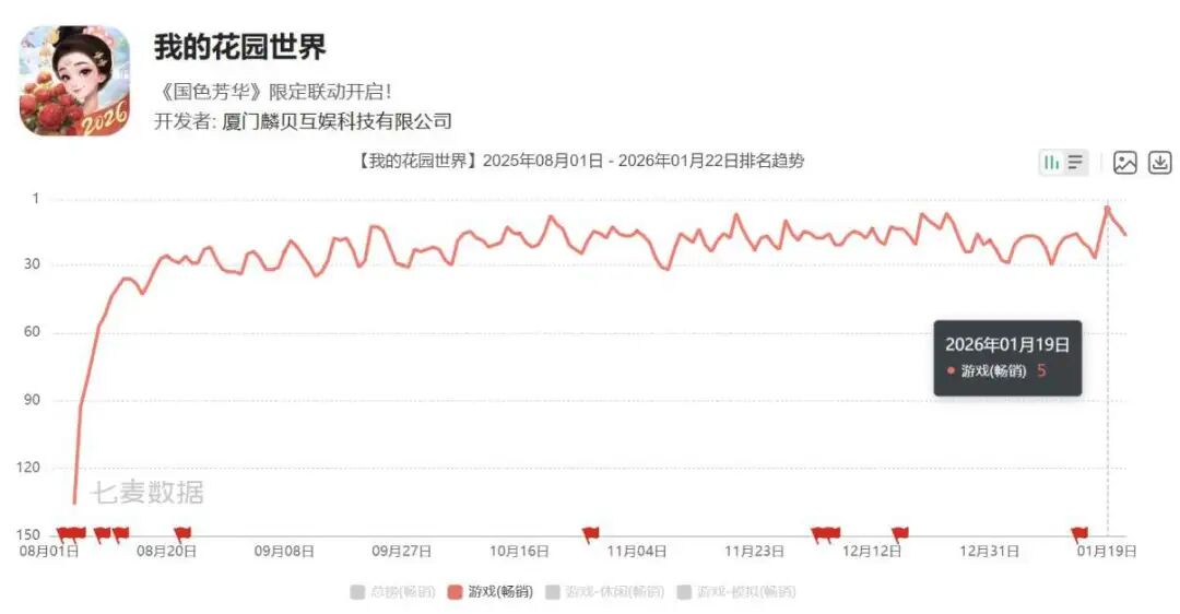 《我的花园世界》尽管8月才上线,2025年的收入已经超过了一众老牌乙游和大厂新游,达到了榜单第3名。游戏采用「种花+经营」的题材,偏休闲治愈的包装首先比较迎合女性玩家、女性泛用户的喜好。上线后,其iOS版本在畅销榜排名一直保持在TOP30,并且还在微幅上升,最近甚至达到了第5名的新高。