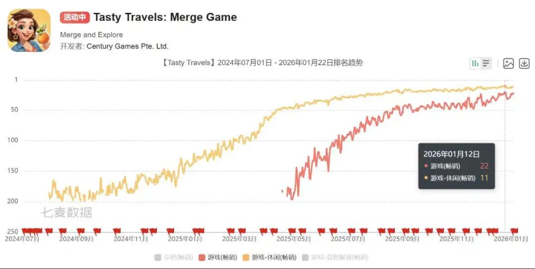 另一个鲜活的成功案例,是位于榜单第5名的《Tasty Travels:Merge Game》。这款游戏作为点点互动打入休闲赛道的先头军,被倾注了相当的耐心。自2024年中上线以来,游戏经过了漫长的调优过程,自去年5月加速运营活动之后开始集中发力,最近已一路攀升至美国iOS畅销榜TOP30,并且同样仍处在上升趋势中。