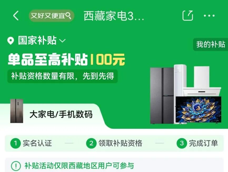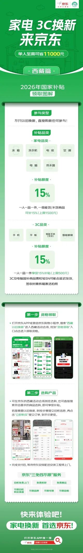 目前,京东西藏以旧换新国补活动已全面启动,西藏消费者可登录京东APP搜索“西藏以旧换新”,领取补贴资格。