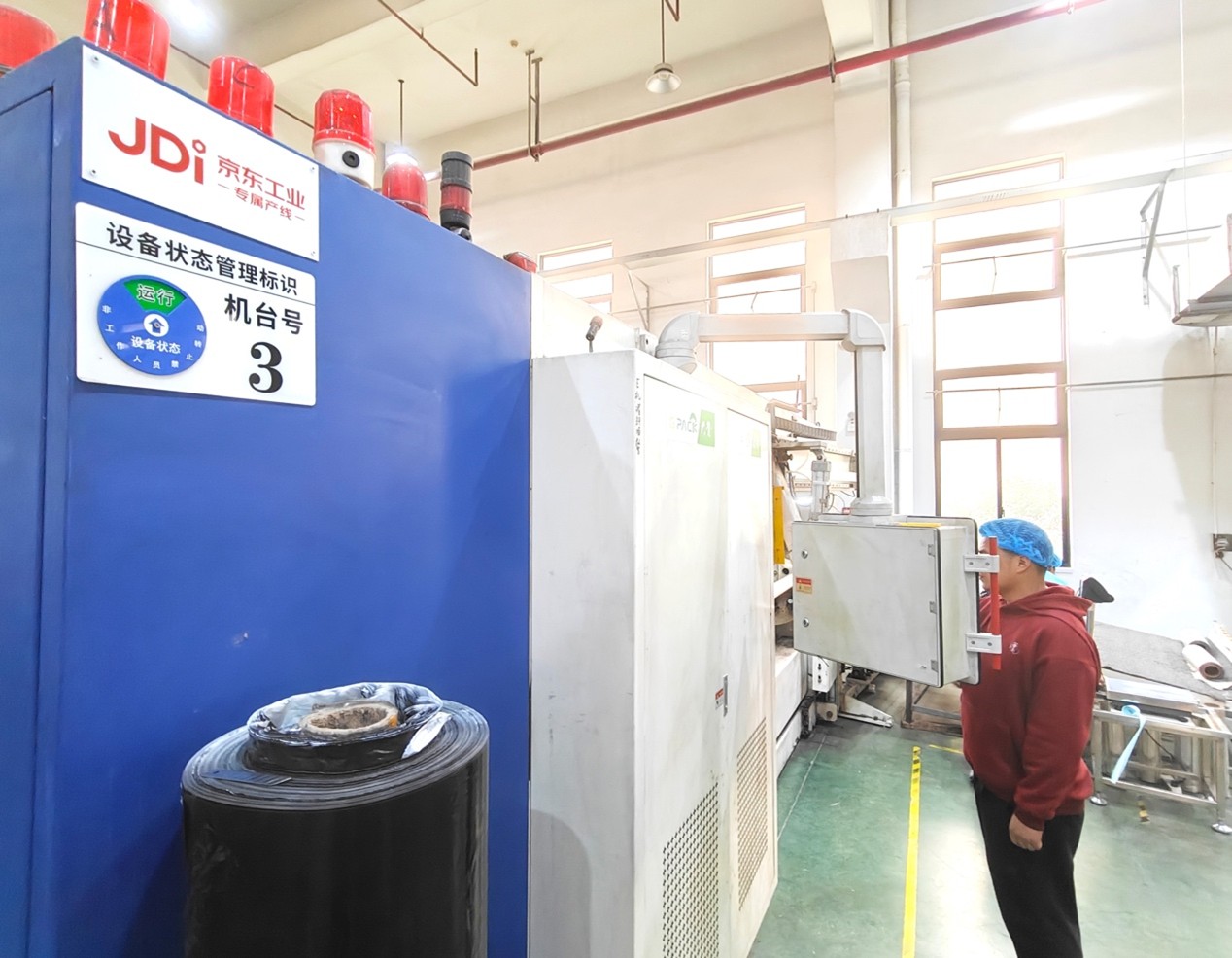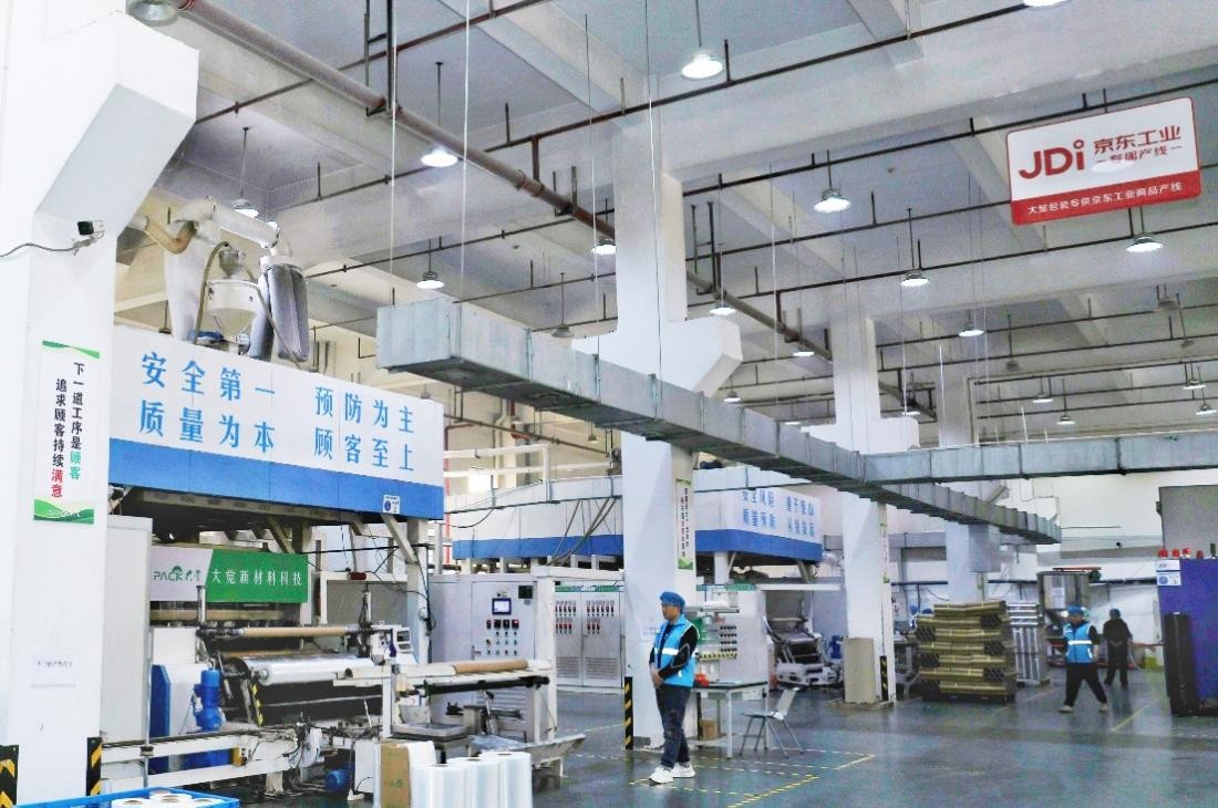 走进大觉(浙江)新材料科技有限公司(下称“大觉新材”),就能看到大型蓝色生产设备的显著位置上贴有“JD 京东工业专属产线”的标识牌。随着设备的高速运转,专属产线上生产出一卷卷包装材料,它们为物品搬运过程中提供稳固、隔离、保护的作用。