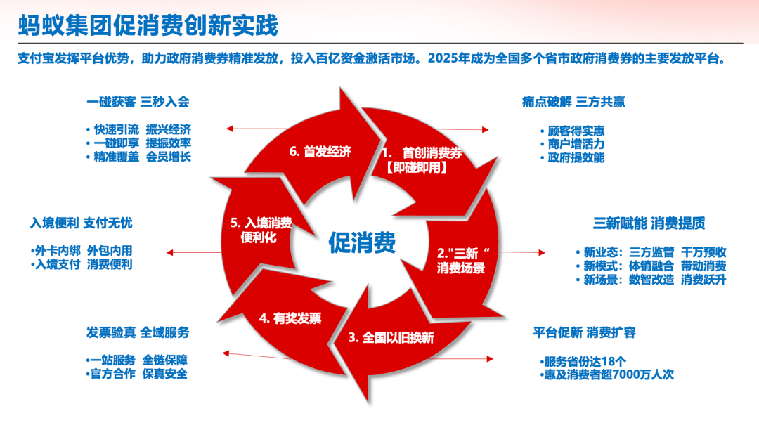 ●数据可视化决策:支付宝为各地主管部门开发的消费券专属智慧大屏,能全面覆盖、动态监测、多维分析区域消费热度,让促消费工作更加可视化、智能化。