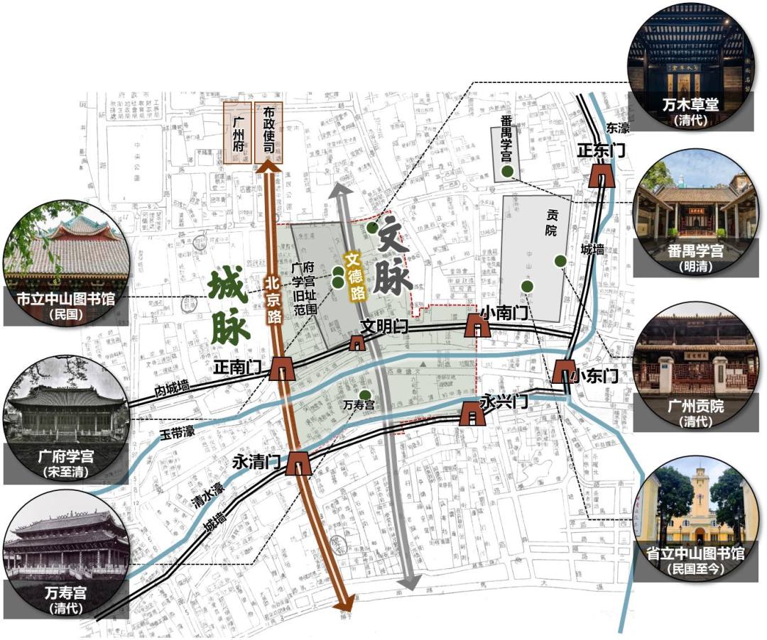文德南历史文化街区自古以来是广州的“文轴”所在,集聚广府学宫、南海学宫、广州贡院、大小马站书院群等文教地标。1918年开辟文德路、1919年拆城墙通万福路、1922年拆城墙建文明路至今,街区仍保留“城—濠—街—坊”的完整格局,但也面临历史建筑老化、生活设施陈旧、功能业态单一等广州老城历史街区衰败的共性问题。