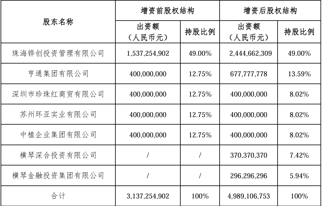 具体来看,此次增资引入两家新股东,分别是横琴深合投资有限公司和横琴金融投资集团有限公司,分别出资4亿元和2.96亿元,增资后持股比例分别为7.42%、5.94%。与此同时,老股东珠海铧创投资管理有限公司、亨通集团有限公司分别增资9.07亿元、2.78亿元,增资之后,大股东铧创投资持股比例不变,仍为49%,亨通集团持股比较上升至13.59%。