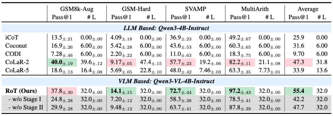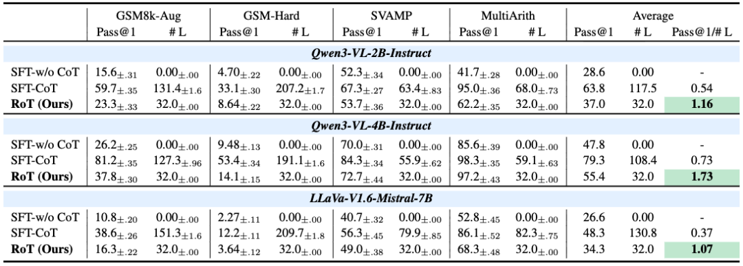 研究团队在 GSM8k、MATH、SVAMP 等多个数学和逻辑推理基准上对 RoT 进行了广泛测试。实验基于 Qwen3-VL 和 LLaVA-V1.6 等主流架构。