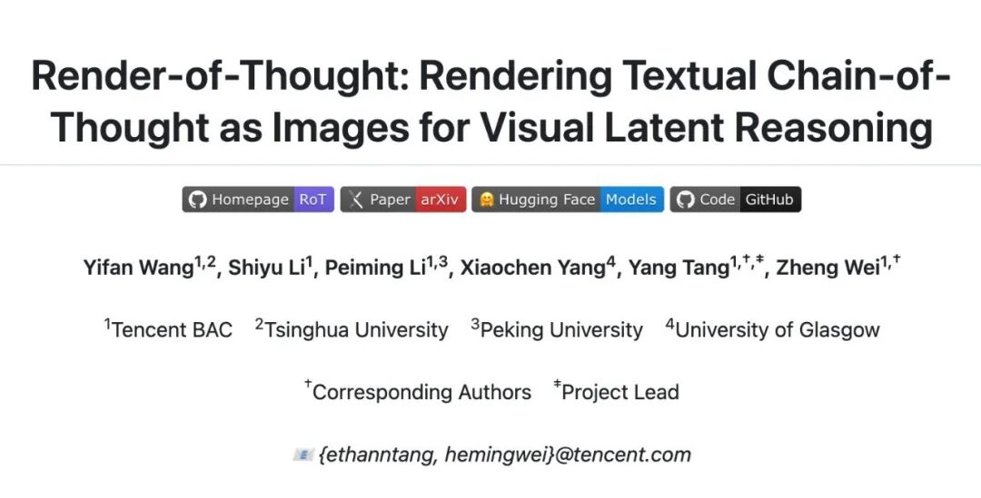 针对这一挑战,腾讯内容服务部 BAC 联合清华大学与北京大学,提出了一种名为 Render-of-Thought (RoT) 的新框架。RoT 的核心思想非常巧妙:利用多模态模型(VLM)已有的视觉编码器作为「语义锚点」,将文本推理步骤「渲染」为图像的视觉嵌入(Visual Embeddings)。