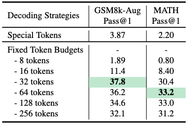 此外,采用固定 Token 预算策略时,每个数据集的最优 Token 预算各不相同。在 GSM8k-Aug 数据集上,32 个 Token 能实现最佳性能,而 MATH 数据集则需要 64 个 Token 才能达到峰值准确率。研究者推测这种差异的出现是因为 MATH 数据集更具挑战性,需要更长的推理链。