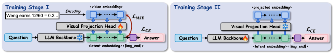 这一阶段冻结了 LLM 和视觉编码器,仅训练一个轻量级的「视觉投影头」(Visual Projection Head)。目标是将 LLM 的文本隐状态映射到由视觉编码器提取的「渲染 CoT 图像」的特征空间上。