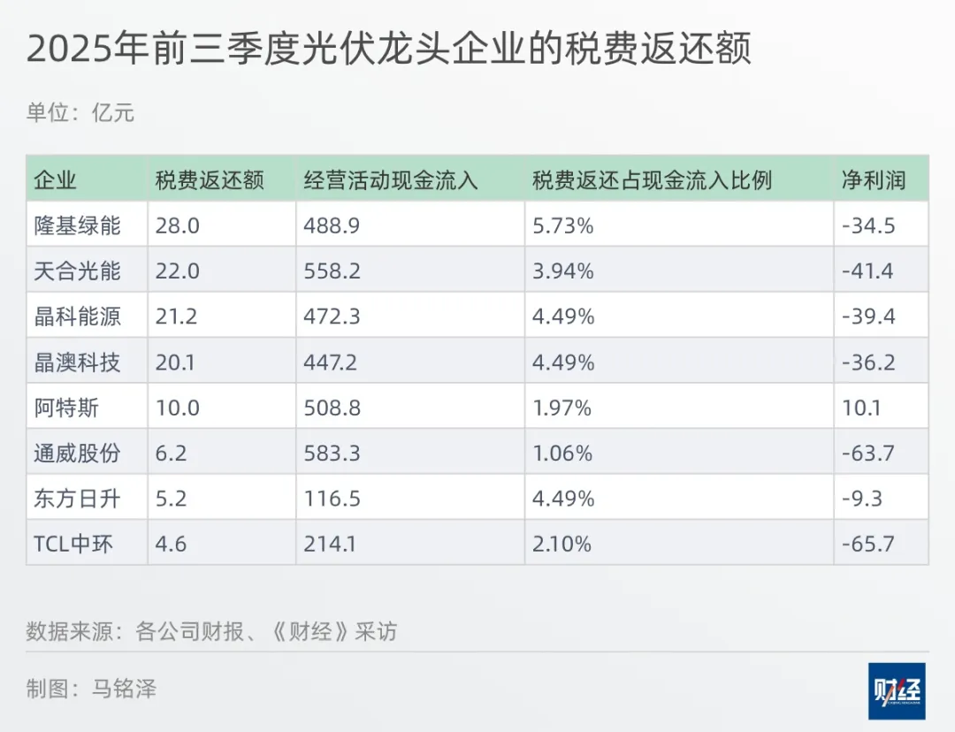 光伏出口退税政策指对出口的光伏产品按一定比例返还已在国内缴纳的增值税。相关公司财报中的退税返还额中大部分来源于出口退税。2025年前三季度,光伏组件四大龙头企业(晶科能源、隆基绿能、晶澳科技、天合光能)收到的税费返还均超过20亿元。