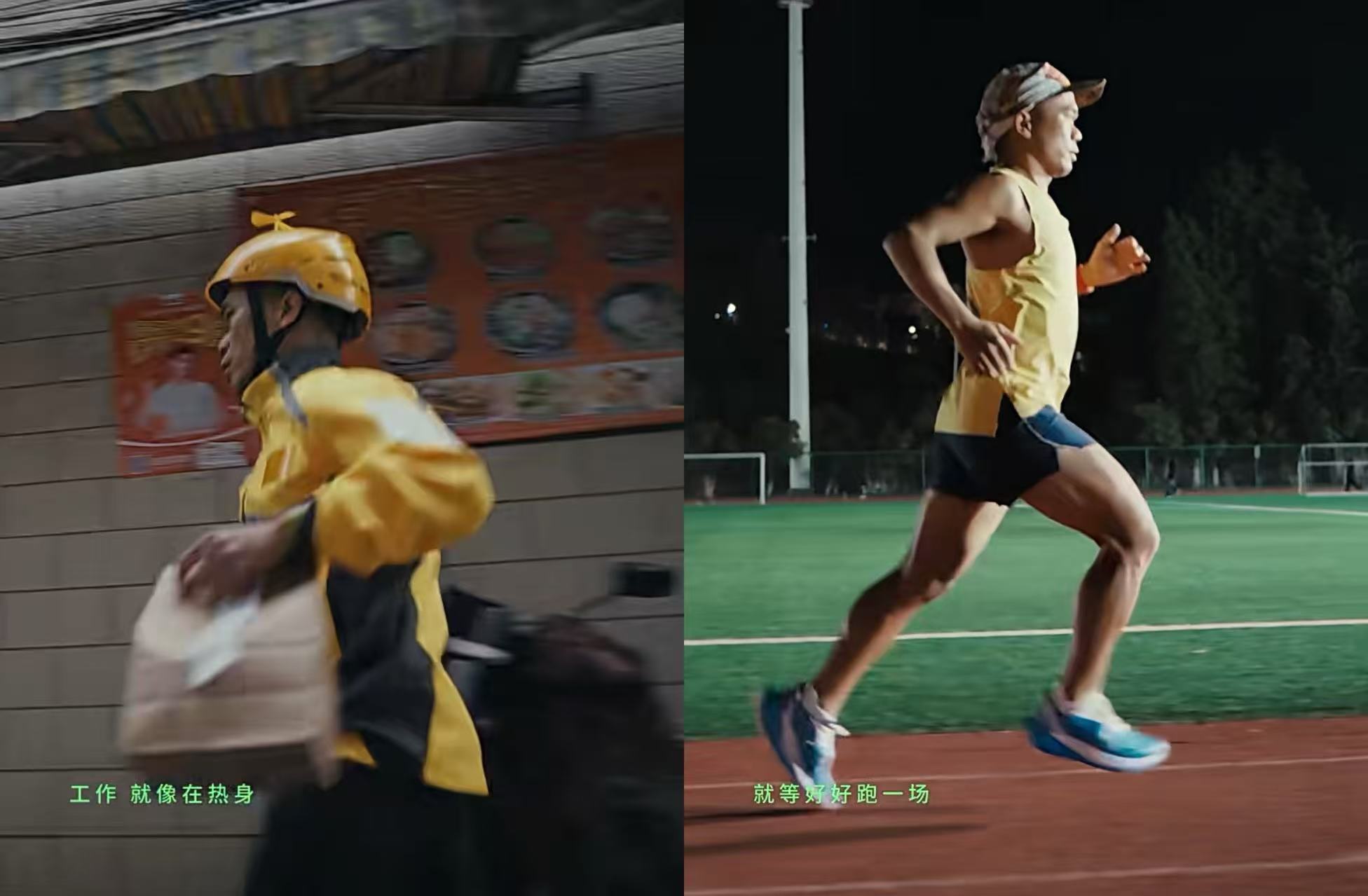 短片里,外卖小哥不骑电动车,拎着外卖满大街跑,到了晚上快下班了,他会专门挑一单送到体育场。然后到了体育场,脱下工作服,换上安德玛的跑鞋,在空无一人的跑道上又接着跑......