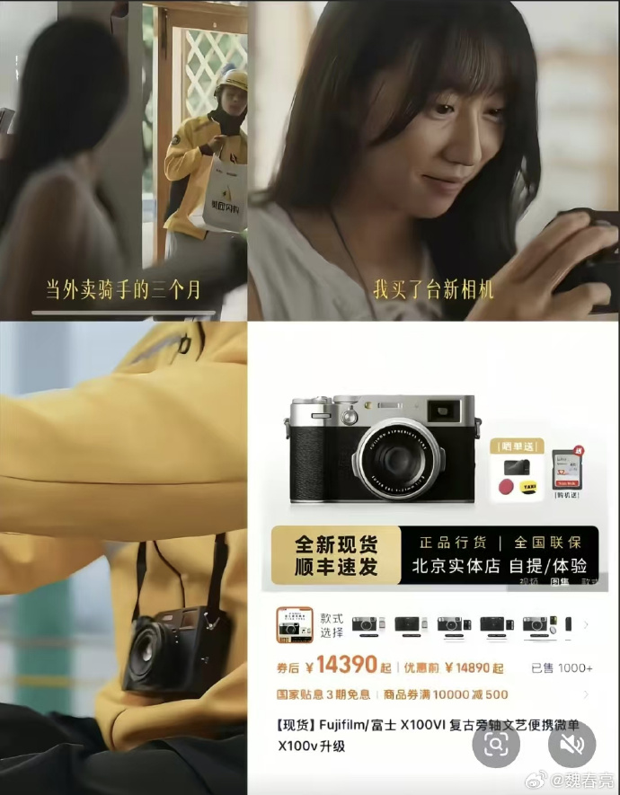 更有人翻出美团那去年那条翻车的短片做对比,外卖女生用三个月工资买了台1.5万的相机,一边送外卖一边拍照欣赏风景。
