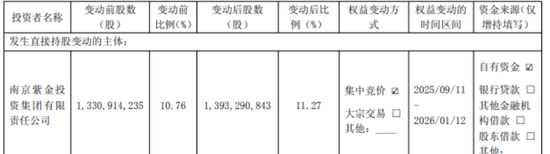 日前,南京银行收到大股东紫金集团及其控股子公司紫金信托于2025年9月11日至2026年1月12日期间,以自有资金增持股份1.23亿股,占该行总股本的1.00%。