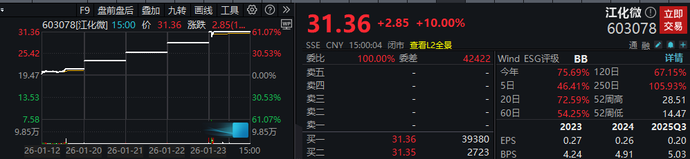 1月23日,本周连板牛股江化微(603078)股价再次涨停,拿下“五连板”。