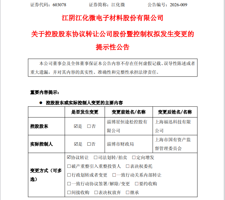 就在股价大涨之前,江化微筹划的控制权变更事项有了最新进展。2026年1月19日,江化微发布公告称,公司控股股东淄博星恒途松拟将其所持有的公司23.96%股份以18.48亿元的总价转让给上海福迅科技,届时,公司实控人将由淄博市财政局变为上海市国资委。