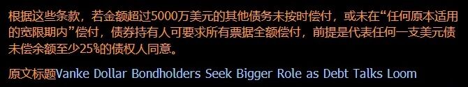 4.PJT一月的时候和投资者说,可以宣告万科境外债提前到期违约,因为境内宽限期延长触发了交叉违约条款,不过这个要集合25%的投资者,目前看只有15%还不够;