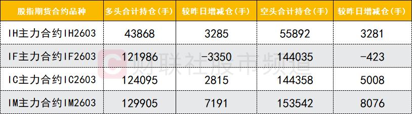 四大期指主力合约中,IH、IC、IM合约多空双方均加仓,IC、IM合约空头加仓数量较多。
