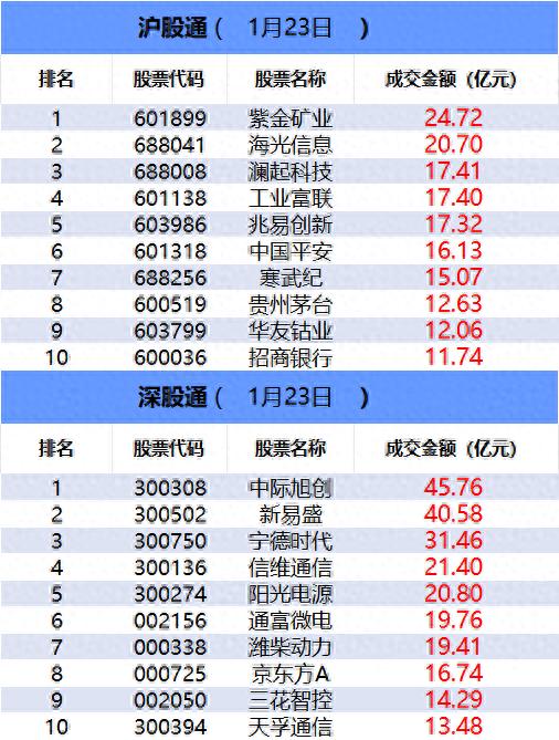 从沪股通前十大成交个股来看,紫金矿业位居首位;海光信息和澜起科技分居二、三位。