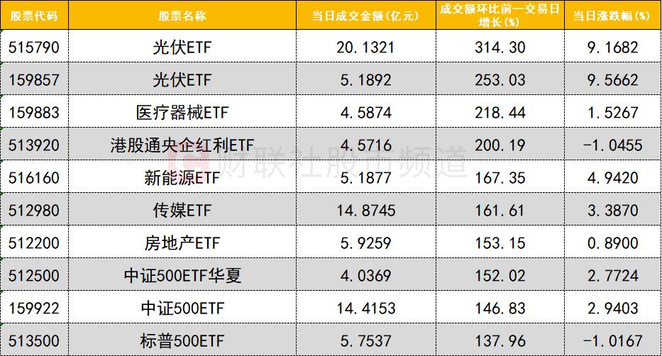 从成交额环比增长前十的ETF来看,光伏ETF(515790)成交额环比增长314%位居首位;光伏ETF(159857)成交额环比增长253%位居次席。