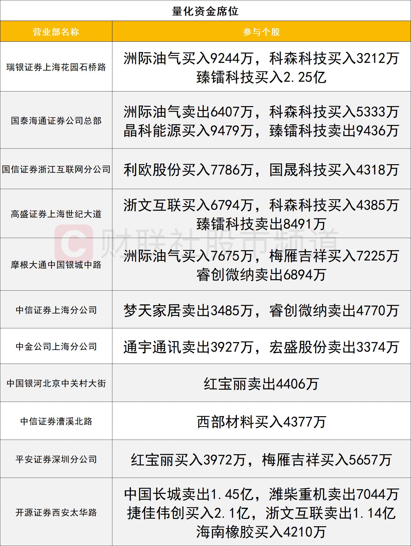 一线游资活跃度较高,商业航天和太空光伏概念集体走强,双热点加持的乾照光电20cm涨停,获两家一线游资(国泰海通证券上海中山东路、国泰海通证券成都北一环路)合计买入2.52亿。另一只商业航天概念股金风科技获一家一线游资(国泰海通成都北一环路)买入2.1亿。
