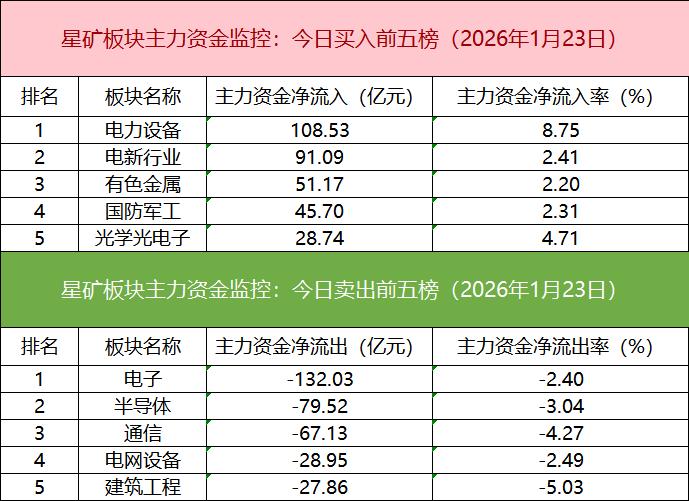 从主力板块资金监控数据来看,电力设备板块主力资金净流入居首。