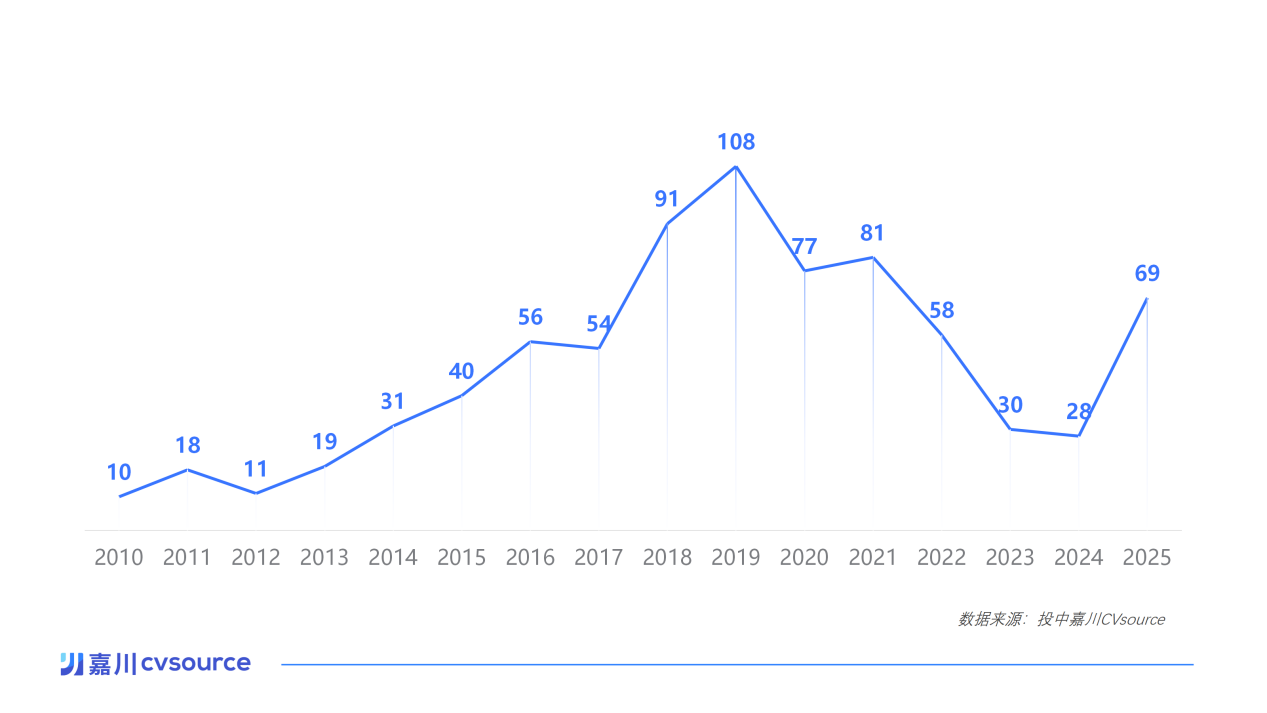 投中嘉川CVsource数据显示,2025年虽没有2019年一年成立超过百家的巅峰数量,但这一年依然有69家创业公司成立(2010-2015年企业成立情况见下图)。