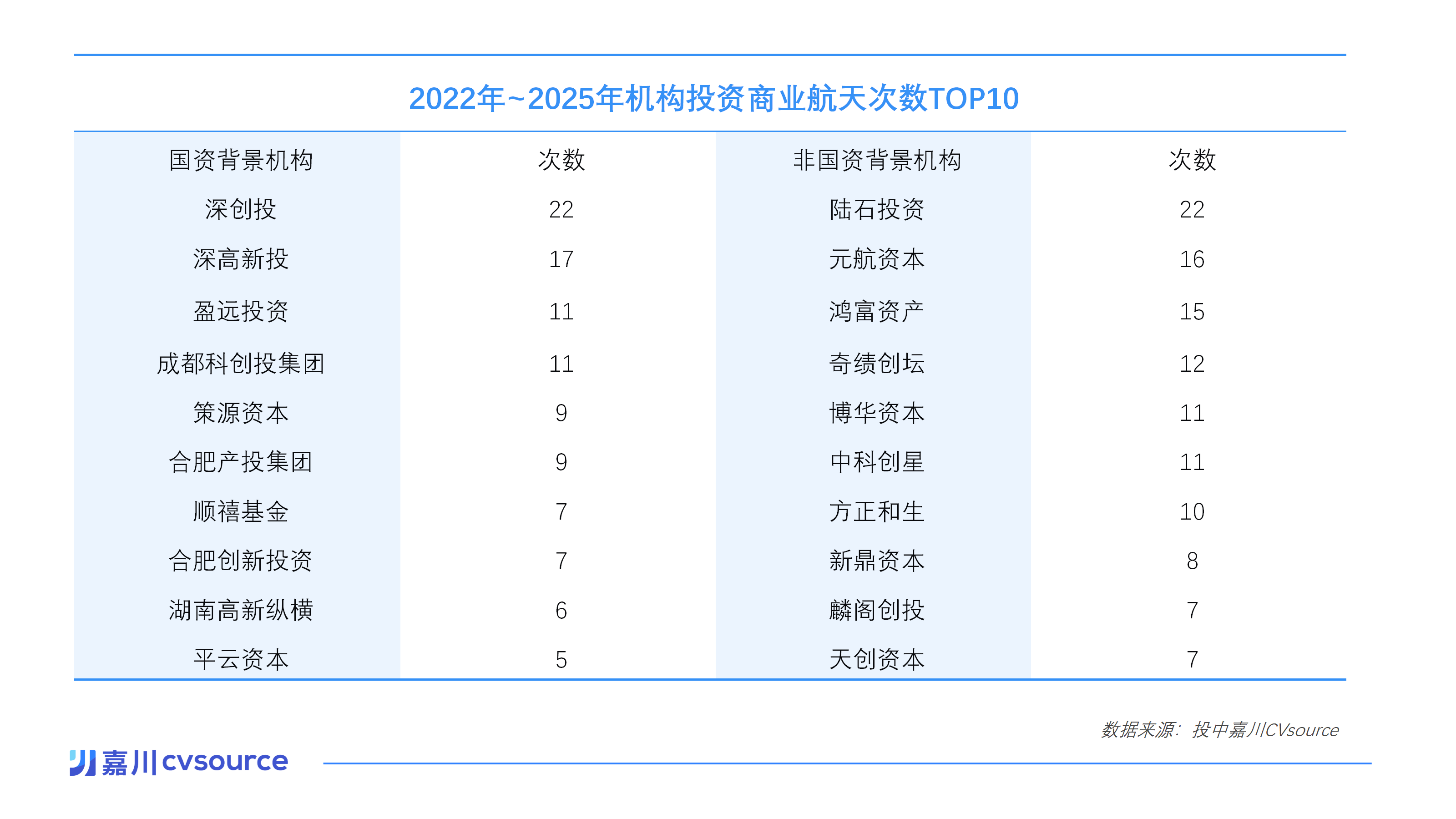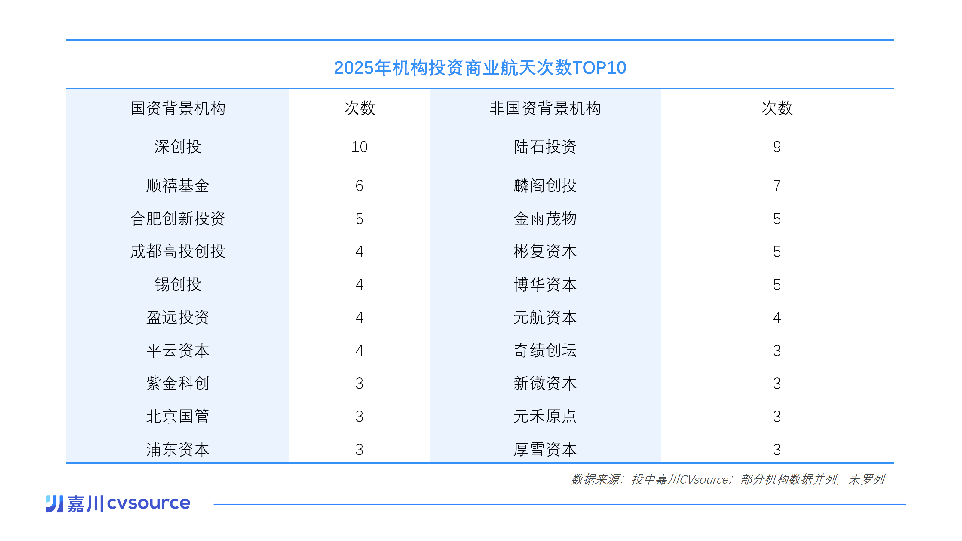 上述机构是商业航天产业的长期支持者。如果只看2025年的数据,国资体系的深创投、顺禧基金、合肥创新投等机构排名靠前。市场化机构中,陆石投资、麟阁创投等机构排在前列。