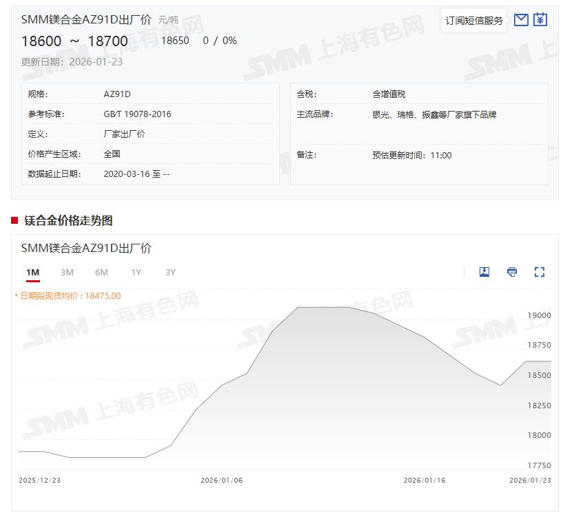 据SMM报价显示:镁合金AZ91D1月23日的报价为18600~18700元/吨,其均价为18650元/吨,较前一交易日持平。