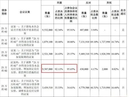 经表决,仅两项议案获通过:一是《关于豁免本次会议召开相关程序要求的议案》,为会议顺利推进扫清程序障碍;二是《关于调整“21 万科 02”回售部分债券本息兑付安排、增加固定兑付安排、提供增信措施的议案》,明确了回售部分债券的处置核心规则。其余三项议案未获通过,反映出持有人与公司在部分条款上仍存分歧,但核心处置方案已达成共识。
