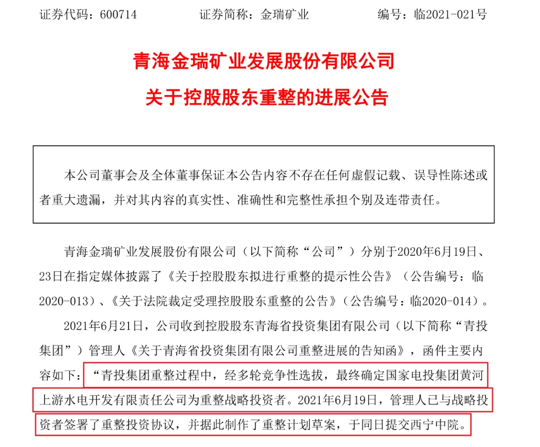 2021年6月22日,金瑞矿业(600714.SH)公告称,控股股东青海省投资集团有限公司管理人发送的《关于青投集团重整进展的告知函》称,“青投集团重整过程中,经多轮竞争性选拔,终确定黄河公司为重整战略投资者”。