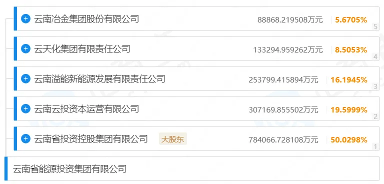 云南省能源投资集团有限公司是以能源、现代物流、绿色能源新材料为三大主业的省属国有重要骨干企业,是云南省能源战略实施和能源产业改革创新发展的重要平台。截至2022年末,集团资产总额2491亿元,实现营收1248亿元,利润总额40亿元,实现经营性净现流90亿元,累计贡献利税超350亿元。集团股权结构如下。