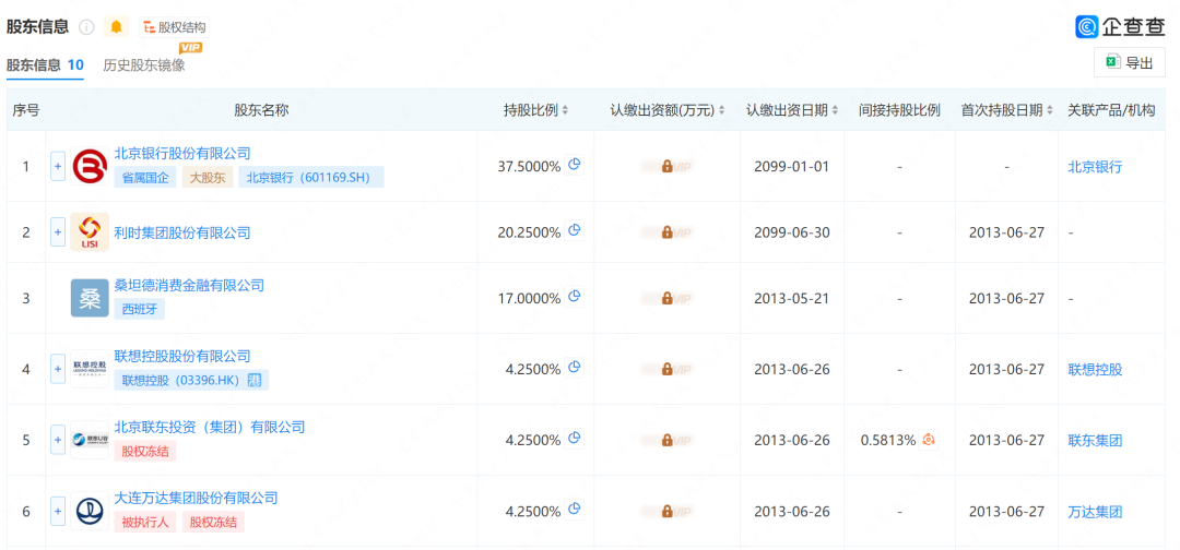 作为北银消金的控股股东,北京银行此次同步提升持股比例。工商资料显示,增资后北京银行持股比例由35.29%升至37.5%,巩固了第一大股东地位;利时集团跃升为第二大股东,持股比例从15%大幅提升至20.25%;原第二大股东桑坦德消费金融有限公司持股比例降至17%;大连万达集团、北京联东投资集团、联想控股等7家原有股东持股比例均不同程度下降。