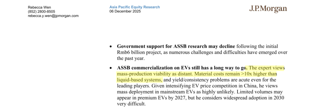 摩根大通在2025年12月发布的一份关于固态电池中试线样品测试专家电话会议记录中,也明确指出,固态电池的原材料成本是液态电池的10倍以上,良品率、一致性等问题也很严重。