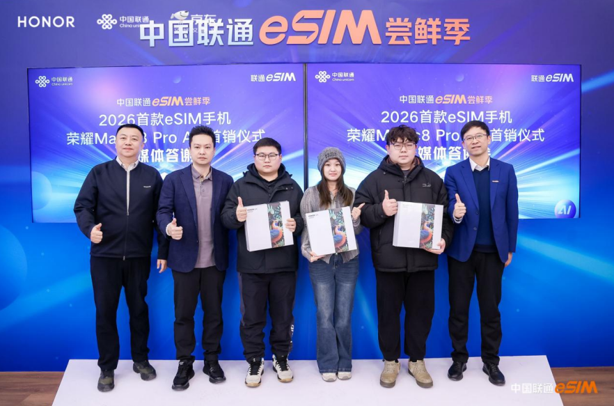 通信世界网消息(CWW)2026年1月23日上午,中国联通eSIM尝鲜季2026首款eSIM手机——荣耀Magic8 Pro Air首销仪式暨媒体答谢会在北京西单联通营业厅隆重举行。中国联通集团市场部副总经理尹少春、联通华盛总经理李立新、荣耀中国区副总裁徐涛、北京联通副总经理秦洋、联通华盛副总经理陈丰伟、京东3C数码事业群手机事业二部总经理卢志锋、京东3C数码事业群运营商部总经理庞誉等嘉宾共同出席,见证2026国内首款eSIM手机正式上市,标志着中国联通与荣耀、京东三方战略合作迈入全新阶段。