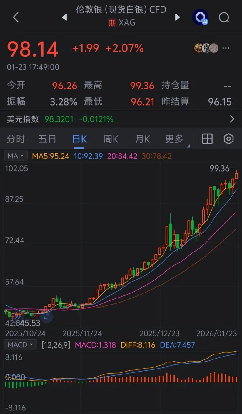 开年以来,白银现货价格在不到一个月的时间涨幅已超过30%。今日(1月23日)现货白银涨幅扩大,盘中触及每盎司99.36美元的历史高位。