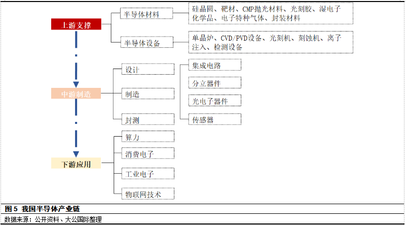 半导体产业链结构复杂、紧密相连,具体分为上游(材料、设备)、中游(设计、制造、封测)和下游(应用)三部分。
